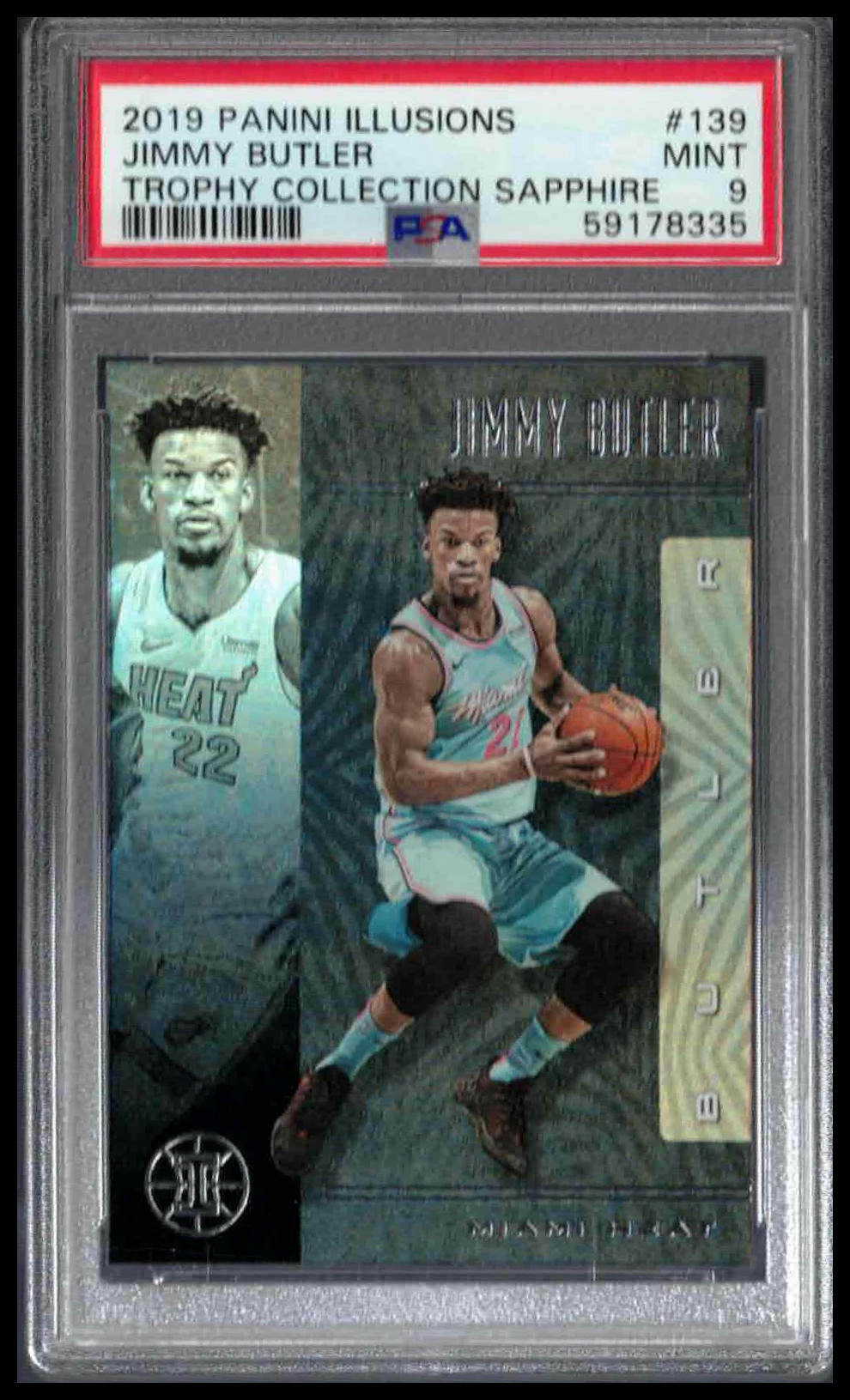 PSA 9 - 2019 PANINI ILLUSIONS #139 JIMMY BUTLER TROPHY COLLECTION SAPPHIRE