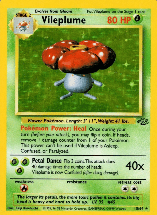 Pokémon Power: Heal Once during your turn (before your attack), you may flip a coin. If heads, remove 1 damage counter from 1 of your Pokémon. This power can't be used if Vileplume is Asleep, Confused, or Paralyzed.